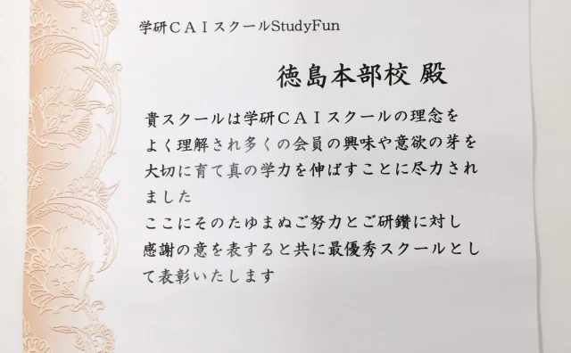 代表日記 徳島本部校が2014年度最優秀スクールとして表彰されました! 5月31日に東京で学研CAIスクール優績スクール会議が開催され、学研CAIスクール徳島本部校が2014年度最優秀スクール... 2015.06.07 2025.10.03 代表日記